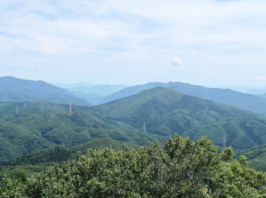 | 今日も朝から猛暑、冠山の山頂で一息入れたあと、展望処から西中国山地の脊梁を眺めやる。ヒノ谷左岸尾根(1014.4峰)の南面に、皆伐域が3か所。赤谷山、大神ヶ岳、三坂山の連なりの奥に広見・半四郎の頂稜が霞んでいる。 | ||