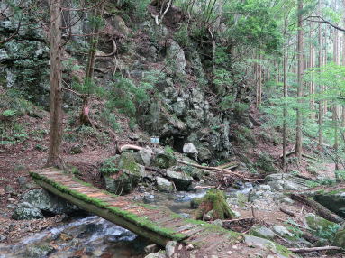 | 南尾根の径(寂地山縦走路)を140mばかり行くと、右(西)に踏跡が分かれる。かつてこの踏跡は、北面を下ったあと西横手に向かい、ホン谷の道に合流していたように記憶しているのだが…。入るとすぐ、踏跡は消失。やむなく西に下るが、地形図の破線径に出合うことはできなかった。闊葉樹林の下生えは薄く、下るのに難はない。そこはホン谷の右岸で、南に転じて沢床に降りると、夏草の生茂る踏跡があった。小川林道からのホン谷ルートを使う人は少ないようで、夏草に埋没している。 | ||