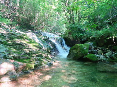 | このあと、美しい渓畔林に親しみながらの快適な溯行がはじまるが、15分で終わる。なんと、前方に渓流釣りの二人連れが。追い越すわけにもいかず、待っていると、気になるらしく引き返してきた。「自分たちはとても遅い。堰堤4上流のゴギを目当てに入渓している。堰堤4までで終わりにしてもらえまいか」、との申し出。ふたつ返事でこれを受け入れる。我ながら、人のいいことである。左岸沿いに堰堤4の天端に上がり、そこから尾根伝いで寂地林道へ出た。上流に大した見どころがあるわけでもないし、これでよかったことにしよう。猛暑日の林道歩きは楽にない。たまらず、ナメ淵の上流に再入渓。クールダウンしながらの下降も悪くない。すっかり汚れが取れて、起点に還った。 | ||