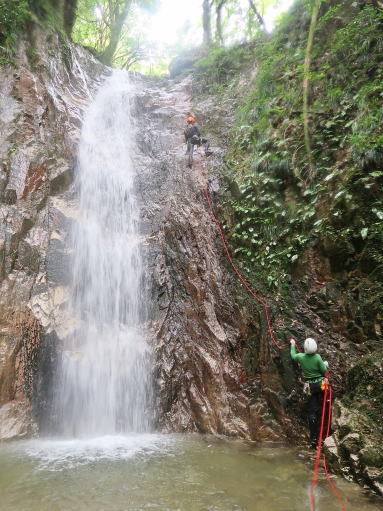 | 落口でギアとロープを整理する、三人の姿がまぶしい。僕も次回は、TRでチャレンジしてみようかな。100mばかり遡って、F7に出会う。ナメの斜滝で、上部はすべるので難しく、右の滝崖を登る。 | ||