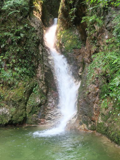 | 水量は少ない。おだやかな谷が10分ばかり続いたあと、ゴルジュ淵が受けるスラブ滝F1に出会う。水流右の直登を試みるが、今年も滝崖に立ちこむこと叶わず。右岸の岩壁を残置ハーケンに拠ってトラバース、左の滝崖中段に飛び降りる有様。ダメもとで、水流左の直登を試みなかったことが悔やまれる。次回は、ぜひチャレンジしてみなくては。 | ||