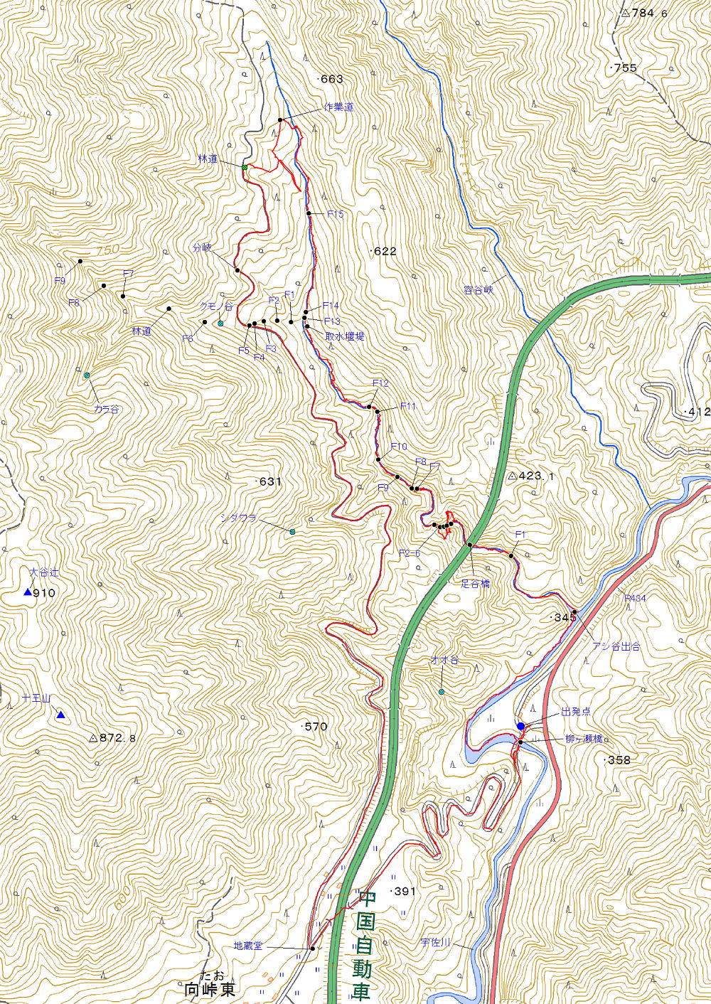 | 柳ヶ瀬橋北詰(錦町宇佐)(7:04/19)→宇佐川入渓(7:22)→足谷出合(7:45)→F1(7:57/8:11)→F2(8:23/53)→F3(9:00)→F5落口(9:24)→F6(9:26/34)→F7(9:47/59)→F8(10:01/06)→F9(10:09)→F10(10:14/25)→F11(10:34)→F12(10:38/49)→取水堰堤(11:09)→右谷F1(11:13)→右谷F2(11:16)→右谷F3(11:36)→遡行終了点(11:56)→作業道(12:01)→林道(12:16)→左谷F5の上(12:25)→向峠東の地蔵堂(13:07)→起点(13:41) |