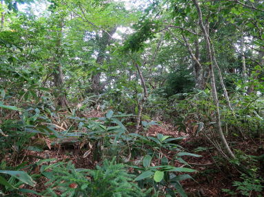 | F6の上は、美しい渓畔林が広がるおだやかな谷になる。小滝F7を越えると、ほどなく水流は消えて、源流域の様相。沢床にガレや泥濘はなく、とても遡りやすい。それでも、急な源頭は楽でない。ひと休みして顧みれば、谷間の樹間に大神ヶ岳を見る。重い腰を上げてゼーハーゼーハー、ヘロヘロで稜線に上がる。この際、広高山の山頂を踏んでから、ボーギのキビレへ下ることに。 | ||