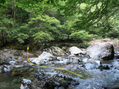 | 前回http://www.anoyama-konoyama.net/180803.html積み残したシラグチ谷の補完と、林道の名前になっているウオキリ谷の地域研究。小川林道2号橋東詰の待避所に車を駐める。出合橋を渡り、R488を右に取る。800mばかり下ったところで、右下の中津谷(なかつや)川にウオキリ谷が出合っている。川床までのササの斜面は、よくすべるので慎重に下る。少し上流の鉄橋を渡れば、右岸から川床へ降りるのは容易いが、鍵のかかった堅固な扉があるので、それは無理。中津谷川の流れはとてもおだやか。右岸にウオキリ谷の小さな水流が見える。 | ||