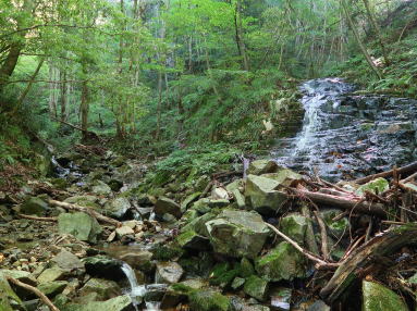 | 谷は少し開けて、渓畔林が美しい。100mばかり遡ると、二段のF13、その90m上流でF14に出会う。いずれもおだやか滝で、登るのは容易。 | ||