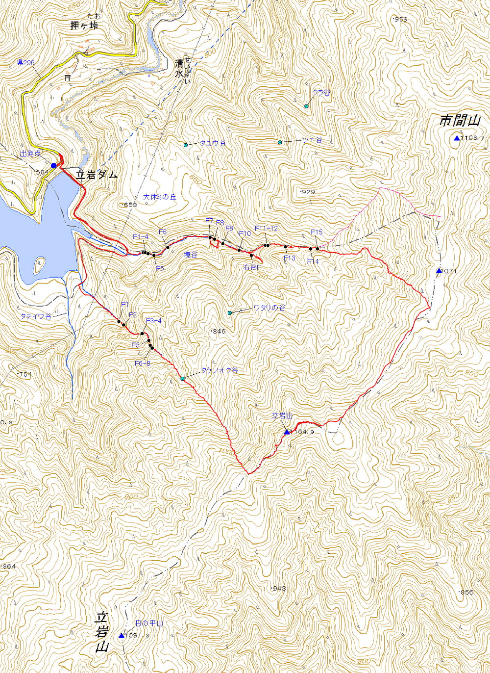 | 立岩ワダム管理所Ⓟ(6:52/7:07)→堰堤天端(7:12/14)→境谷入渓(7:23)→F1(7:29/33)→F2(7:34)→F3(7:38)→F4(7:42/45)→F5(7:47/51)→F6(7:58)→F7(8:14/20)→F8(8:22/38)→F9(8:45/50)→F10(8:54/9:09)→右谷F(9:12)→F11(9:36/45)→F12(9:46)→F13(9:53)→F14(10:04)→F15(10:10)→市間山立岩山縦走路(11:14)→立岩山(11:44/12:24)→鞍部(タケノオク谷取付)(12:33)→タケノオク谷F8(13:26/28)→F7(13:30/32)→F6(13:36/38)→F5(13:42)→F4(13:49/51)→F3(13:53)→F2(14:06/17)→F1(14:18/23)→立岩貯水池(竜神湖)右岸道(14:40)→境谷出合(14:48)→起点(15:00) |