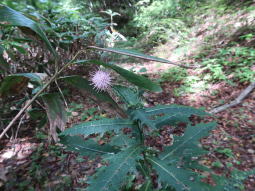 | 道端の草花に親しみながらポレポレ起点に還り、大宮八幡宮にお参りする。まっすぐな長い参道の奥に、寛政七年(1795)再建の本殿が鎮座している。平成18年の台風19号の突風で参道の杉並木の3分の1が倒伏などの被害を受けた。このため、参道北面の見通しはよく、蔀山と毛無山を一望できる。 | ||