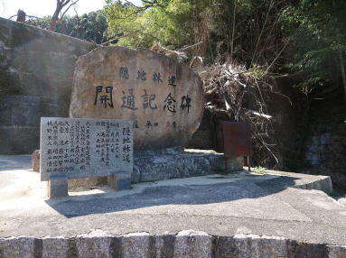 | 四周遮るもののない絶佳の山頂には、展望やぐら、同期の千本桜碑、五省の碑などが建てられ、園地整備されている。江田島、能美島の山々をしばし眺めやり、展望やぐら南側のブラ擬木階段の道を下る。この階段の勾配は相当なもので、上りだと大汗をかきそう。林道に降りると、西入口の北側に大きな石碑が建っていた。地元の早稲本武雄先生の顕彰碑で、刻まれている字は達筆すぎて読めない。 | ||