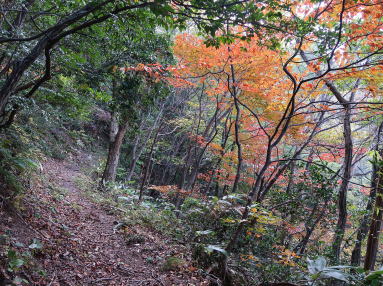 | キャンプ場に寄り道して、お不動さんにお参りする。玉峰山連絡道をポレポレ下り、覚融寺の下で顧みれば、黄葉の玉峰山が見送っている。ほどなくの分岐を右に取り、玉峰山荘の前を通って起点に還った。 | ||