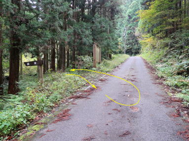 | 孫滝を過ぎると谷は穏やかになり、ほどなく玉峰山連絡道に出る。谷奥地区から上がるこの舗装林道は、玉峰山へのメインルートになっている。雌滝コースを引返して一本松跡の稜線道へ戻る。 | ||