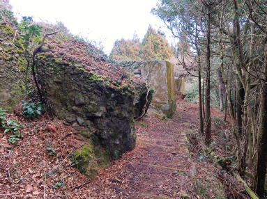 | 歩道は岩屋権現から北に向かっており、たどれば県道101に出る、と思う。この際、東に下る石の参道に入ってみる。石段はすぐ終わり、踏跡らしきものも途絶える。典型的なトロイデのこの山の東面に、明瞭な尾根などあるはずもなく、地理院地図の破線径を目指して下る。スギ林床の下生えは薄いが、幾重にも重なる棚地の石垣に難儀する。ようやく破線径らしい踏跡を見つけて南に向かう。ほどなく廃屋に出会って里道が現れ、15分ほどでオレンジロード(広域農道)に合流した。 | ||