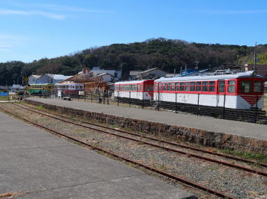 | 目の前に瀬戸大橋が広がり、河津桜が彩を沿えていた。県道393号鷲羽山公園線を左に取る。鷲羽山ハイランド入口の先で南に下る遊歩道に入り、風の道に戻る。西に向かい、掘り切りのような風の道を抜けると、住宅地が開けて下津井駅の跡に出た。モハ103、ホジ3などの車両が保存されている。 | ||