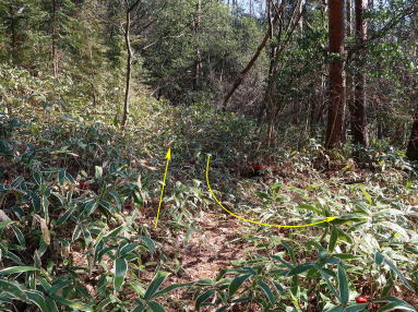 | 作業道は約15分で終わる。うち後半の5分は、ひざ下のササが茂っている。このあとササの茂った山道になるが、薄く丈も低いので、まったく問題ない。山道になってほどなく、左の支谷へ分岐。ちょっと探ってみると、150m先で消失していた。 | ||
