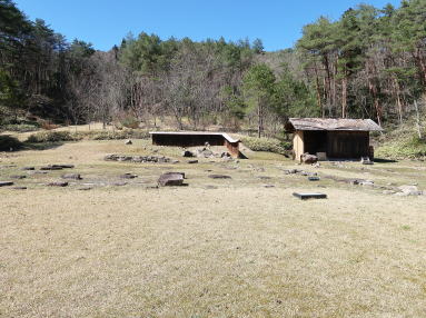 | 一直線の参道跡が約200m、ガイダンス施設「青松」の背戸に出る。表に回ってザックをおろし、青松に上がらせていただく。出土品や万徳院復元模型などに、しばし親しむ。帰途、海応寺の吉川元春館跡に寄る。表門跡と石垣の遺構に出会い、広い館跡に上がって往時をしのぶ。立派な台所が復元されているが、板葺の屋根はもはやボロボロ。 | ||