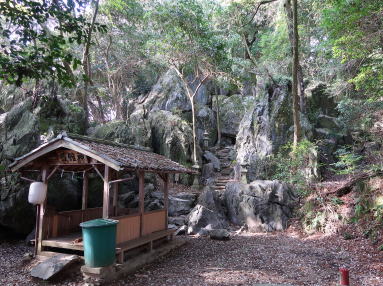 | 樹林の尾根に踏跡があり、10分足らずで北の丸広場に上がる。空堀跡、岩国城再建天守、二の丸広場、時計塔とめぐって、護館神へ。護館神は、岩国城石垣の石切り場の跡に、居館を護り城山を鎮めるために祀られた静かな霊地。拝殿の下から右の径に入って、護館神の峰を越える。城山周回ルートに合流して、姉ヶ山の展望台で一息入れる。瀬戸のしまなみは、今日も霞んでいる。城山の稜線には電波塔が多い。とりわけ姉ヶ山には、山口朝日(yab)、テレビ山口(tys)、エフエム山口(FMY)などが。おかげで、山頂の西面が開け、蓮華山や高平山などを眺めることができる。 | ||