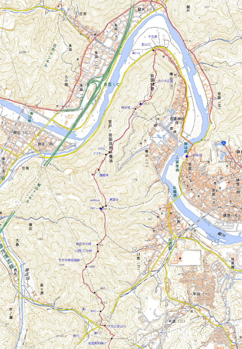 | JR五日市駅(6:03/08)⇒JR岩国駅(6:43/52)⇒錦帯橋(7:05/10)→千石原登山口(7:30)→岩国城跡(7:56)→護館神(8:19)→展望台(8:31)→廿日市南岩国線96(8:52)→大応山登山口(9:13)→岩国美和線27(9:26)→岩国火力連絡線15(9:55)→大応山(10:27/33)→反射板(10:41)→展望の丘(11:02)→一ッ葉山分岐(11:18)→南岩国柳井線9(11:35)→桜峠(11:46)→由宇線11(12:17)→米山(12:34)→峠(13:05)→山田公会堂(14:16)→JR通津駅(14:48/58)⇒JR岩国駅(15:11/20)⇒JR廿日市駅(15:52) |