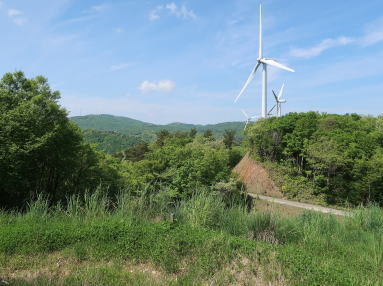 | 掛山の南東肩に、風車№16が建っている。南西面が開けて、空山、弥畝山の風車群を眺めることができる。北西側法面の際を上って掛山へ。途中顧みて、東方に鷹ノ巣山や掛頭山など見る。掛山のてっぺんは、ササが茂る闊葉樹林で展望はない。三角点は、頂稜北西の灌木の中にひっそり立っていた。 | ||