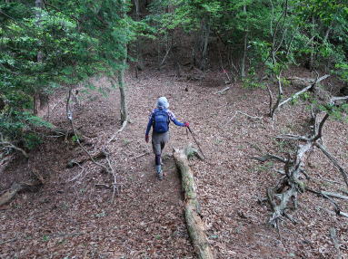 | 鞍部に戻り、主稜線の道を南にたどる。道はよく踏まれているのだけれど、だらだらと長い登り。はじめのピーク(781峰)に、ひと休みにおあつらえの平岩が。カミさん、思わず腰かけていた。さらにアップダウンを繰り返して15分、ようやく大掛・小掛別れに至る。 | ||