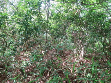| 広いバラス道が伊勢坊谷川左谷の左岸に続いて、約1㌔先で終わる。谷に降りると、二俣の右谷に明瞭な破線径あり。これを詰め、約23分で稜線鞍部へ上がった。途中、踏跡が消えるところもあるが、テープもあり難しいところはない。尾根道を左(北)に取って約15分、大掛山南峰へ上がる。てっぺんは雑木に覆われている。北に約110m、大掛山の山頂に着く。北方に樹木越しの千代田工業団地や雉子の目山(きじのめやま)などあるが、見晴しはないといってよい。以前は海見山や滝脇山がよく見えていたのに…。 | ||