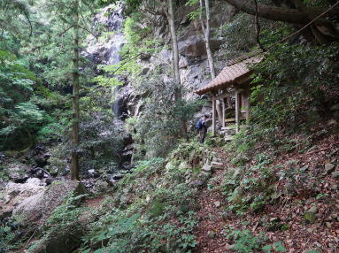 | 平坦になった横手道を約200m、谷の小さな流れを横切ると、林道前龍頭線が隣接する。遊歩道は、谷の左岸に沿って下っている。ここは瀧ヶ馬場と呼ばれるところで、林道には駐車場広場が設けられ、立派なトイレがある。権現坂と名付けられた急斜面をジッグザッグに8分、右に駒ヶ滝への道が分かれる。入るとすぐ滝に出会う。30mを超えると思われる直な露岩を、ささやかな水がすだれ状に伝っている。落口の上にも多段になって続いているのかもしれない。直登は僕にはとても無理。左岸の龍頭観音にお参りしたあと、目洗瀧をめぐって遊歩道に戻る。すぐ龍頭観音一丁の観音石仏に出会い、以後登山口手前の六丁まで続く。 | ||