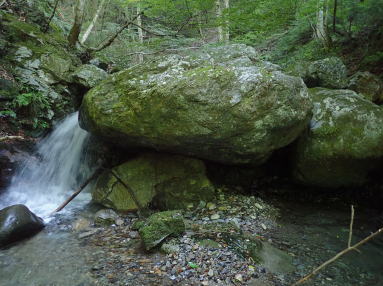 | ゴーロの谷がしばらく続いて、大ゴルジュに入る。F13と思しきゴーロの小滝に出会って、右岸の懸崖に目をやれば、小杉苗の谷の「すだれ滝」が落ちている。すだれ滝直下のV字2条の小滝を過ぎて顧みる景色は、この谷の圧巻だ。この崖を攀じるサワラーを僕は知っている。大ゴーロを少し下ったところで、C/SF12、2段F11(下段斜2条)に出会う。いずれも滝面を下るのは難しくない。ほどなく第二金庫岩。下流側からの形は、どう見てもお結び。このあと、穏かなゴーロ谷が400mばかり続いて左谷が出合う。途中で出会ったF10、F9、F8は、カウントしてよいものか悩むほどの小滝。F7を特定できないまま、F6を滑り下る。愉しいお清め。ゴーロの谷をヒョコヒョコ下って、起点に還る。 | ||