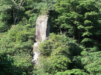 | 「天狗の落涙」という甌穴奇岩は水量が多いため、ふつうの瀬になっていた。水流を遡行するのは、ちょっとやばいかも。天狗橋で水瓶岩(はんどいわ)を間近にめぐる左岸コースと、甌穴岩の大ゴーロをめぐる右岸コースに分かれる。左岸コースはアップダウンがあるので、あまり踏まれていない。左岸コースから右岸コースに戻る橋の東詰に清心亭があるが、かつての茶店も今やふつうの休憩所。これより上流にも見どころ多く、甑岩や大天狗岩の岩壁に付けられた「日電歩道」ばりの遊歩道などはみごと。草通(あけび)岩のあるゴルジは、とても遡れそうにない。「鬼の試刀岩」を見てほどなく、舌震橋。散策マップ図には舌震上橋とあるが、下舌震橋はどこに? | ||