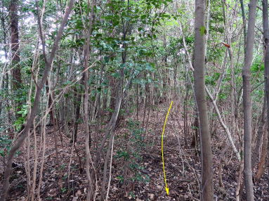 | 権現山からは、南東の市境尾根をたどる。明瞭な取付はないが、少し下ると地籍調査杭に沿う踏跡が現れる。が、この地籍調査杭や踏跡が曲者で、分岐する支尾根に迷走、市境尾根を西に外して大平峠に降りた。秋芳町側に山道があり、取り付くと市境尾根に沿って続き、350.6峰で途絶える。が、ヤブは薄く、ほどなく孟宗竹の侵入したヒノキ林になって、鞍部に降りた。地蔵堂の建つ峠で、左(東)の杉山への道は消えているが、右(西)の大滝側には踏跡がある。鞍部を上り返して市境尾根をたどると、茂りはじめる。もはや12時前、この暑さではとても桂木山まで行く気にはなれない。残念だけど、今回はここまでにしておこう。 | ||