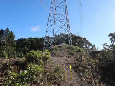 | 皆伐地は507峰の南西面まで続き、山頂を乗り越して東尾根の道へ下ると、ふたたび伐採地になって開ける。北東に萩市(碁盤ヶ岳など)の山々、南に荒滝山などが見える。荷卸し場になっている小鞍部を上り返したところに、鯨ヶ岳を背にした新山口幹線鉄塔110が建っている。こちらも鉄塔111に勝るとも劣らない素敵な展望地。とりわけ北方の見晴らしがよく、大藤山(おおとうやま)、定仙山(じょうぜんやま)、熊ヶ峠山(くまがたおやま)などのほかに、十種ヶ峰まで遠望できる。 | ||