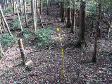 | 灌木が混交するヒノキ林の尾根道を、アップダウン・蛇行を繰り返しながら東に約35分。地籍調査杭の立つ分岐ピークに至り、道は東尾根へ続いている。地形図によると、市境尾根は北東に向かうのであるが、取付が茂って尾根筋が分かりにくい。で、右往左往さんざん迷走したあげく、ようやく分水嶺に軌跡を残す、という有様。負け惜しみかもしれないが、ここは地形図どおりでないような気がしてならない。明るいヒノキ林の鞍部を上り返したピークが図根三角点の立つ札か辻山(434峰)で、これより北支尾根から鉄塔巡視路が合流して主尾根(市境尾根)に沿う。300mばかり先の肩で皆伐地になり、眼前に新山口幹線鉄塔105の小ピーク、その右手に市境の峰々が連なっている。 | ||