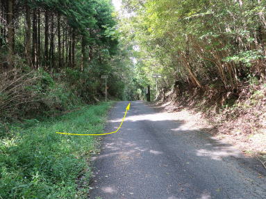 | 南東に向かう尾根道は、約600m先で南と東に分かれる。南は大滝頭(おおたきのかしら)方面で、東が陰陽分水嶺の市境尾根。市境尾根へ下ると、小鞍部の南面に二反田コースが分かれていた。谷沿いに径があり、美東大滝を経てR490に出るらしい。 | ||