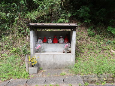 | 桑の木(くわのき)の三叉路で左の里道に入り、滝の河内(たきのこうち)、学ヶ峠(がくがたお)、小野峠(おのとうげ)を経て県道28号線に出る。途中、峠や集落の要所でお地蔵さまに出会うとても長閑な散策路。県道28号線も車の往来は少なく、三隅川のせせらぎを聴きながらポレポレ歩く。約1.2㌔で山中集落に至り、ほどなく起点に還った。 | ||