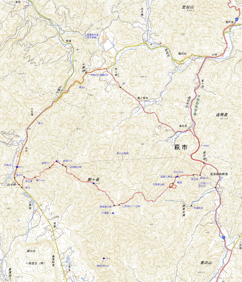 | 美東町赤の桂木山登山口(7:36/47)→山中峠取付(7:54)→登山道(8:04)→廃TVant(8:17)→新山口幹線鉄塔111(8:32)→507峰(8:44)→新山口幹線鉄塔110(8:49)→鯨ヶ岳(9:15)→南尾根分岐(9:43)→二反田コース分岐(9:51)→支尾根分岐(10:26/59)→札か辻山(11:07)→新山口幹線鉄塔105(11:23)→笹目峠(11:43)→桑の木(11:58)→滝ノ河内(旧森川菖蒲園)(12:15)→学ヶ峠(12:32)→小野峠(西木間のお地蔵さん)(12:38)→県道28号線(12:49)→起点(13:06) |