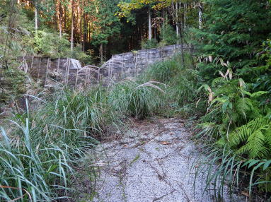 | 昨日に続く陰陽分水嶺歩き。男岳北東の乗越鞍部から桂坂峠までつないだ。美東町岩波の県道307号佐々並美東線路肩スペースに車を置く。東に約150mたどり、左の里道に入る。岩波川右谷の奥の切浴(きりえき)へ上がる途中、集落の右岸に岩波生活改善センターがあり、前の岩波橋から西方に権現山(543m)が望まれる。奥の切浴へ向かうまっすぐな里道を上っていくと、最奥民家の横手から林道東岩波線がはじまる。谷に沿うコンクリート舗装された道で、なかなかの急こう配。たびたび砂防堰堤に出会う。やがて、板張りの砂防堰堤が現れ、その下で林道は終わる。 | ||