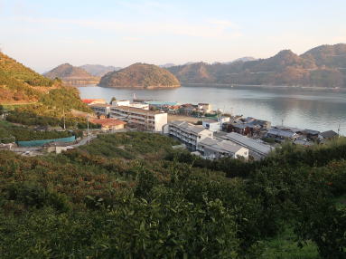 | そこは尾根の切通しで、左手向かいに遊歩道の続きがある。上り返すとすぐ休憩広場になり、ターザンロープや丸太吊橋などの遊具を見かける。草が茂って、使われている様子はない。東屋の先から東面へ下り、管理車道に再合流する。長ーい車道歩きがはじまる。行き交う車はなく、下るばかりなので楽ちんそのもの。標高200mあたりまで高度を下げると、行く手(北)に久比港や来島などが望まれ、道の両側はミカン園、という道行きになる。道端で収穫作業中のご婦人に挨拶して通り過ぎると、「ちょっと早いけどお持ちなさい」の声。振り返れば、シラヌイ(デコポン)を持ってきてくださる。なんと素敵なおもてなし。幸甚の至りである。満ち足りて久比(くび)へ下り、とびしま海道を起点に向かう。海岸線の眺めも悪くない。 | ||