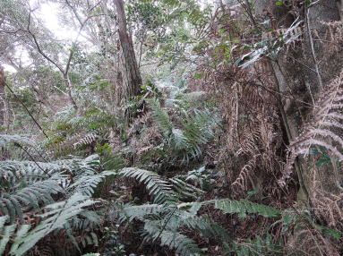 | 県民の浜ルートの取付は、コシダが茂ってとても分かりにくい。ルートも荒れてはいるが、西ルートのように茂るところがないので、断然歩きやすい。わけなく、県民の浜輝きの館前の市道大浦恋線に降りた。 | ||