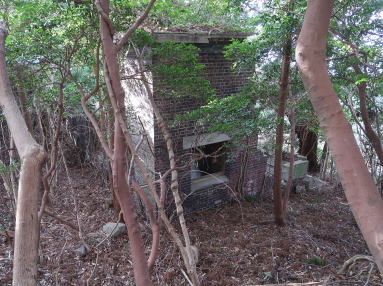 | 輝きの丘展望台から砲台跡への稜線道は、コシダや灌木が茂るところもあるが健在で、8分(約290m)ほどで頂稜展望台に出会う。展望台からの眺めは、周りの樹木に邪魔されて、まるで悪い。北に踏跡をたどると、ほどなく旧軍遺構のある224.5峰(砲台跡)に達す。展望はない。三角点標柱のそばに円形のコンクリート台座が残っている。砲台のような大がかりなものではないので、据えられていたのは探照灯ではなかろうか。来た道を戻り、輝きの丘展望台の手前から県民の浜ルートへ下る。途中の南西頂稜に南東面が開けたところあり。屋久比島、斎島などを眺めやる。 | ||