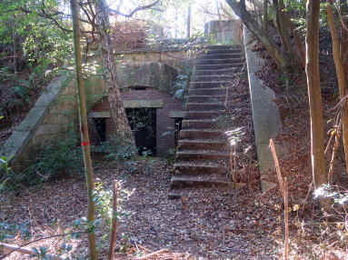 | 早々に後戻りして尾根筋の踏跡を北にたどると、40mも行かないうちに砲台観測所跡の上に出た。コンクリート製の円形凹地の真ん中にヤマザクラが育っている。北側が開放されて左(西)に階段があり、観測所の下は掩蔽部になっている。ここからも、左(北西)横手に第一堡塁への道がのびている。北側の尾根筋へ上り返すと、先の堡塁に比べて造りが雑な円形石積に出会う。通路の天板が崩れ落ちたのや竈のようなレンガ積み、そして円形の凹地なども見かける。75年前、この地に探照灯があったというから、その遺構なのかもしれない。 | ||