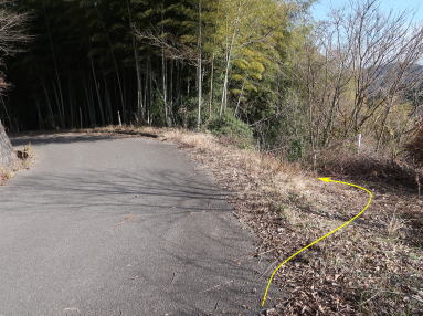 | 左尾根の道もしっかりしており、166峰を過ぎると鉄塔巡視路になって、大柿線鉄塔55に出会う。見晴しはない。鉄塔の先で主尾根はバカ尾根になって北に向かうが、北東に流れる支尾根の道を下る。約80m下ったあたりから、円形凹地や石積を見かける。75年前、一帯には防空砲台が築かれていたというから、その遺構の一部なのかもしれない。尾根筋に道が続くが、北面に現れた林道終点へ降りる。 | ||