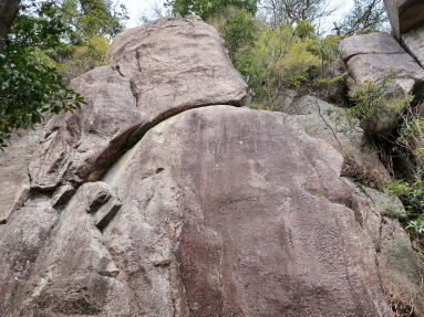 | 広島市の里山歩き。昨日に続いて窓ヶ山でクライミングプチ体験、合わせてアプローチルートの調査。窓ヶ山憩の森(安佐南区伴西町)の平次林道待避所(第1駐車場の約80m西)に車を駐める。平次林道終点の中国自然歩道ルート案内板の右横から、憩の森コース中央登山道がはじまる。ひと上りで休憩東屋に出会い、ほどなく主稜線。仏峠・向山(ほとけだお・むかいやま)への道を左に分けている。右に取って約90m、左横手に第2スラブへの径が分かれる。入るとすぐ、魚切東コースが交差する。西へ横切り、第1スラブ、第2スラブ正面を仰ぎ見て、第2スラブ西面の基部へ下りる。 | ||