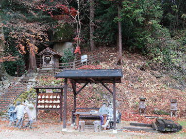 | 師匠に津和野街道のことを聴かれた。アプローチで断片的に歩いているものの、その時の様子は忘却の彼方で、返す言葉もない。この際、きちんとたどってみることにした。はじめは栗栖から廿日市まで。廿日市市役所前駅7時5分発の広電バス(佐伯線)に乗り、終点の津田で下車。下り線というのに、渋滞で10分余りの遅れ。小雨の中、県道30号廿日市佐伯線を西進。約2㌔先の旧道右手(東側)斜面に、奇岩「重なり岩」あり。この岩に市杵島姫命が帯をかけたと伝わり、大岩の下に帯掛明神が祀られている。温かく迎えてくださるかかし人形とその作者さんに感謝! | |