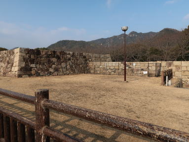 | この際、寄り道して亀居城跡をめぐる。慶長13年(1608)に福島正則が毛利氏の守りとして築城、3年後には破却された。本丸、二の丸、三の丸、有の丸、なしの丸、松の丸、名古屋丸、捨の丸など、その規模は10町歩におよぶ。現在、城郭公園としてして整備され、桜の名所になっている。本丸跡からの眺めは、素晴らしい。 | |