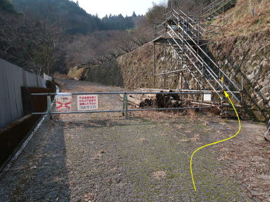 | 旧街道の町なみに戻って南進、小方橋北詰交差点を横切ってすぐの新御園橋を渡り、新町川右岸の道をたどる。新御園橋北詰あたりに一里塚があったらしいが、その所在は分からない。御園台への道を捨てて、山陽自動車道沿いに直進。御園トンネル北出口を見てすぐの三叉路に、歴史の散歩道案内板あり。南の道に入ると、立入禁止のバリケードが施され、右手の石垣擁壁に単管パイプの階段が付けられている。これが苦の坂への取付のようだ。ジッグザッグに階段を上りきると旧街道に出合い、さらにひと上りで苦の坂の峠に至る。峠の手前に、逓信省が昭和初期に造った長距離電話中継所の遺構あり。孟宗竹が蔓延る一帯は、かつての古戦場。慶応2年(1866)6月14日、進軍中の幕府軍(高田藩)1000余の兵を長州軍の遊撃隊250余が急襲、高田軍たまらず、小方側へ敗退したという。 | |