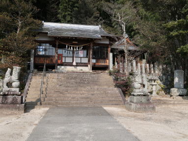 | 木野(この)側の道は、少々ガレている。10分ほど下ったところで、榺池(ちきりいけ)神社の参道が右に分かれる。平坦一直線の参道を約120m、切石積基壇の上へ南面して建つ榺池神社に出会う。御神体には、祭神の市杵島姫命が苦の坂から榺池に投げ入れた榺(千切り)が祀られているという。参道分岐iに戻って右へ20m、県道1号岩国大竹線へ合流する。木野の渡し場へ向けて南進。 | |