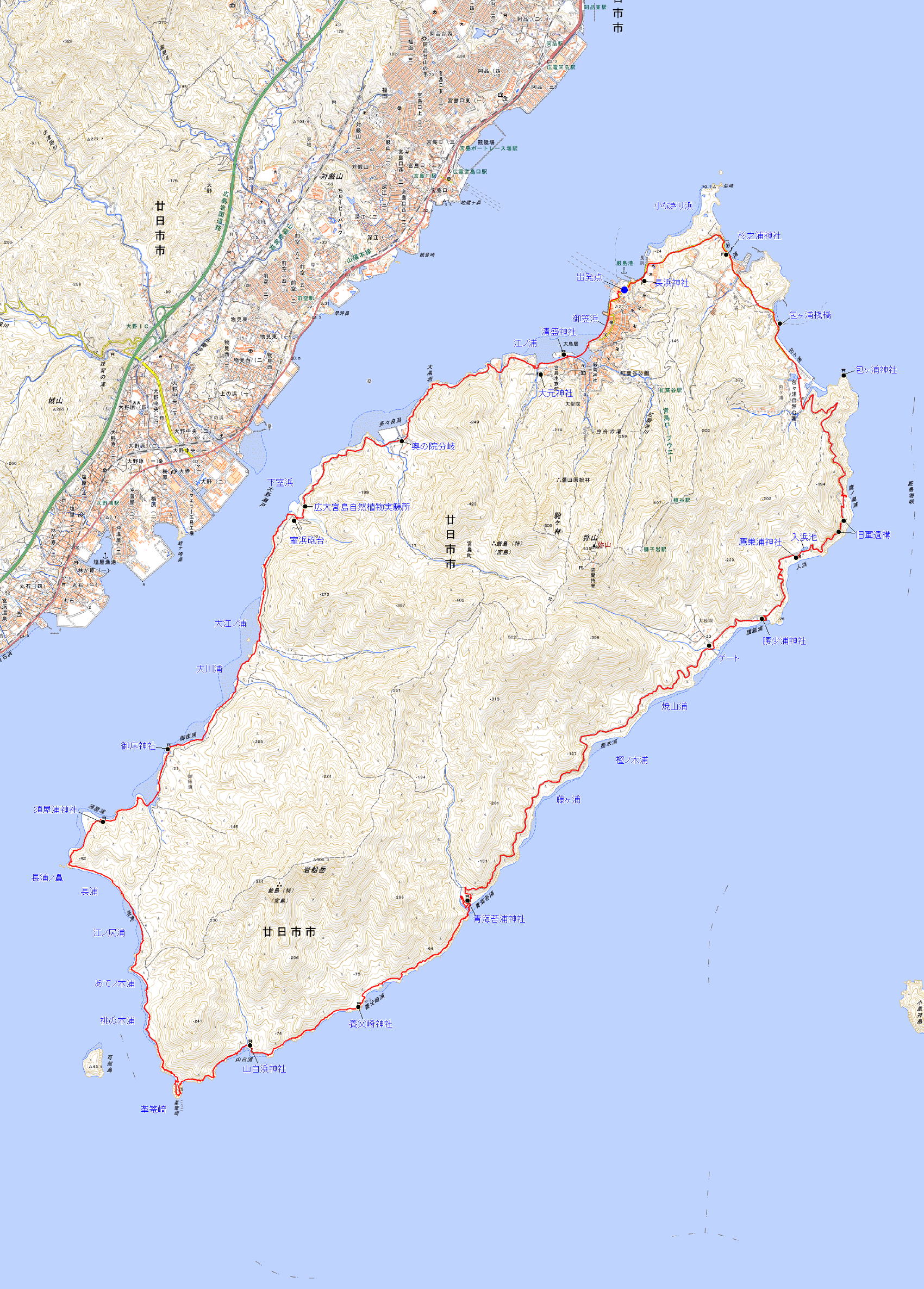 | 宮島桟橋(6:35/39)→御笠浜(6:43)→清盛神社(6:50)→奥の院分岐(7:15)→広大宮島植物実験所(7:31)→下室浜(7:36)→大江ノ浦(7:58)→御床神社(8:23)→須屋浦神社(8:46)→長浦の鼻(8:57)→長浦(9:02)→江ノ尻浦(9:11)→あてノ木浦(9:20)→桃ノ木浦(9:30)→革篭崎(10:12)→山白浦(10:36)→養父崎神社(11:10)→青海苔浦(12:01/59)→ゲート(13:55)→腰少浦神社(14:06)→鷹巣浦神社(14:27)→鷹ノ巣浦(14:44)→包ヶ浦(15:19)→杉之浦神社(15:37)→長浜神社(15:49)→宮島桟橋(16:00) |