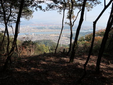 | 南東尾根の参道を下ると、5分でグリーンラインの熊ヶ峰ひろばに出た。北側の熊ヶ峰登山口から、山頂まで10分かからない。盛り上がった広場に休憩ベンチが一つ、四周に見晴らしはない。南ルートへ下って約130mのところに素敵な展望所があり、芦田川河口堰、箕沖コンビナート、JFEなどを一望できる。展望所からからひと下り(約5分)すると、沼隈支線鉄塔3に出会い、ほどなくグリーンラインに合流した。 | |